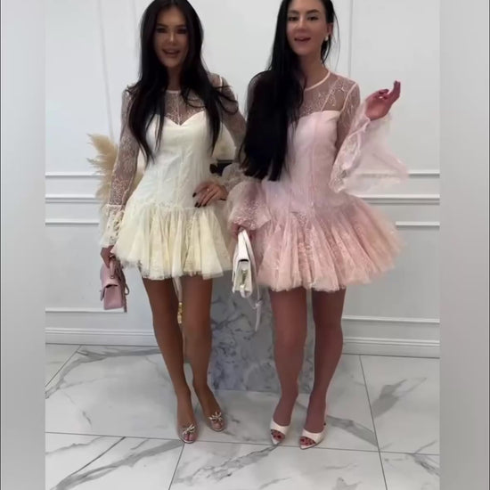 Елегантна къса дантелена рокля с вталена кройка, която подчертава силуета и създава изключително женствена визия. Моделът е прилепнал в горната част, а от талията надолу се разкроява в нежна, ефирна линия, придаваща лекота и движение. Роклята е с фина подплата за комфорт и дискретност, като същевременно запазва красивия ефект на дантелата. Закопчава се с цип в задната част за лесно обличане и перфектно прилягане.